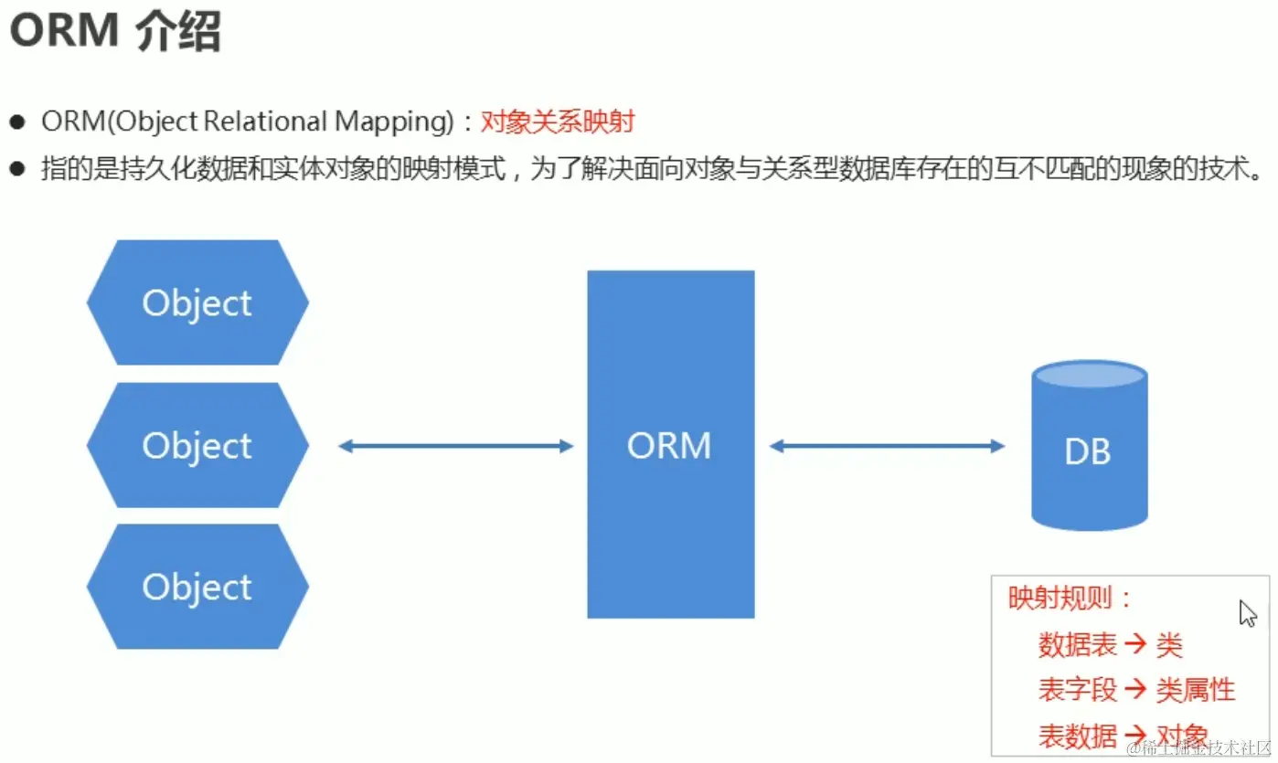 简单来说就是我们的数据库里的数据表的内容在我们java程序里是要将数据封装为一个对象来表示的,而java里的一个对象里的内容也是要将其数据取出来放到我们对应的数据库里的数据表中的,这个过程靠的就是ORM。这里我们是存在映射规则的,首先我们的一个数据表就代表一个类,比如说我们的Student数据表,在我们的java程序中就是一个Student学生类。而表中的字段就是类的属性,比如我们Studnet数据表中的age字段就代表了学生类中的age属性,而表中的数据则是我们所需要映射到我们的对象中对应的属性的数据