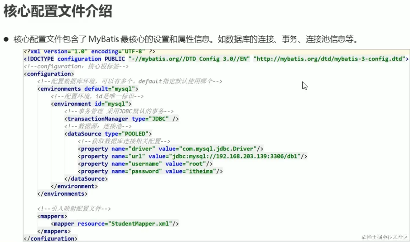 这里最上面的也是固定内容,同样提供好了,我们复制黏贴。然后我们要写入configuration标签,然后写入environment子标签,子标签下有default属性,这个属性指的是我们默认采用的配置,比如我们这里填入mysql,那么其默认就会寻找environment标签里id属性为mysql的配置来执行,这也侧面说明了我们可以在这个配置文件下编写多个配置内容。然后我们写入transactionManager标签,type属性我们填写JDBC,然后我们写入dataSource标签,type属性写入POOLED,代表连接池,然后再写入property子标签,标签下的属性name和value,就分别写入我们之前填写过的driver,url,用户名和密码那些就行了