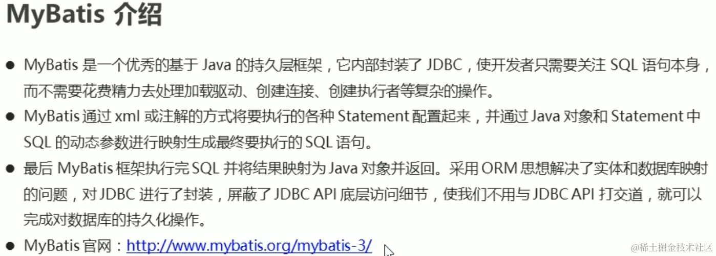 首先我们的MyBatis是一个基于java的持久层框架,内部封装了JDBC,开发者只需要关注SQL语句本身,不需要去处理其他复杂操作。其次是MyBatis通过xml或注解的方式将要执行的Statement配置起来,并通过Java对象和Statment中的SQL动态参数进行映射生成最终要执行的SQL语句。最后是MyBatis框架执行完SQL并将结果映射为Java对象并返回,这里采用了ORM思想,内部对JDBC进行了封装,使我们不必与JDBC打交道就可以完成对数据库的持久化操作