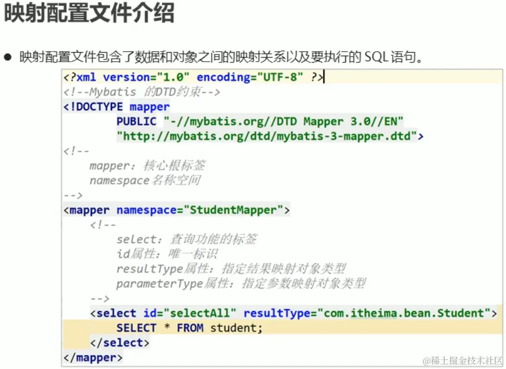 最上面的内容是固定的内容,规定了字符集和其他的内容,在我们的资料中有提供,我们直接复制黏贴就完了,后面我们要指定mapper标签,然后我们要写入namespace属性,然后写入对应的select标签,加入id属性,以及赋予将数据映射给对象的对象地址(放在resultType属性中,指定地址就可以了),然后标签内部写入我们对应的sql查询语句,我们这里写入查询全部的sql语句