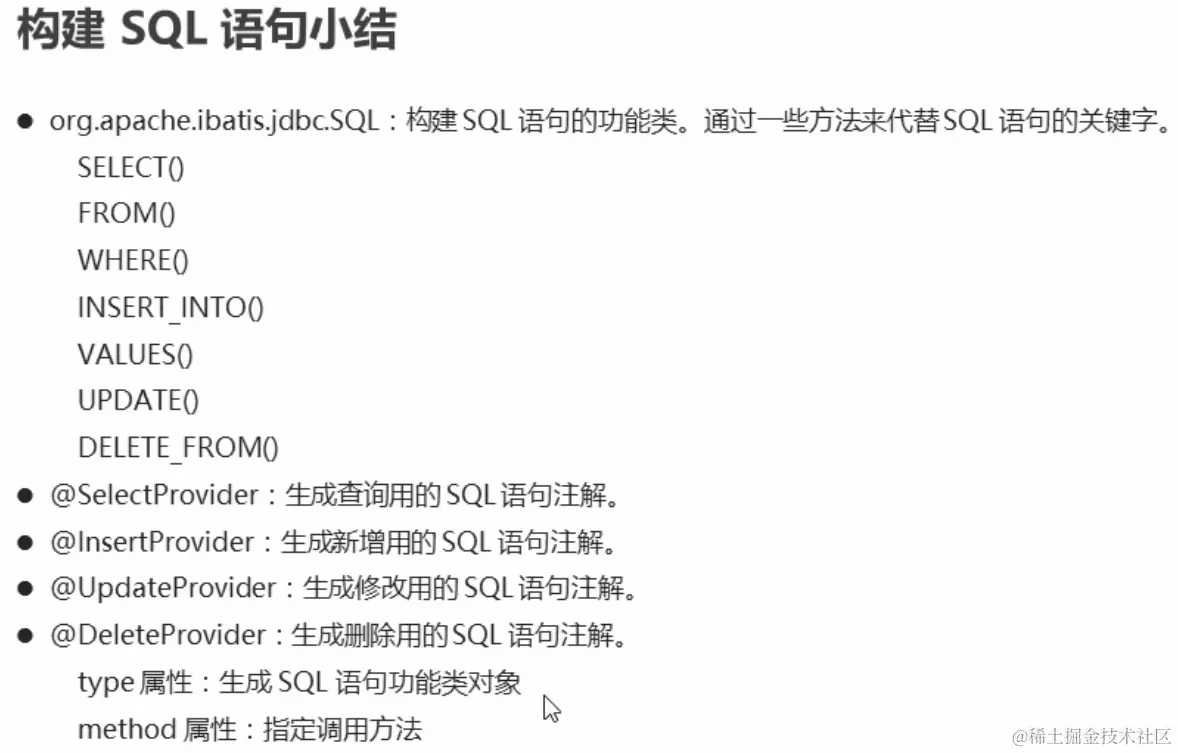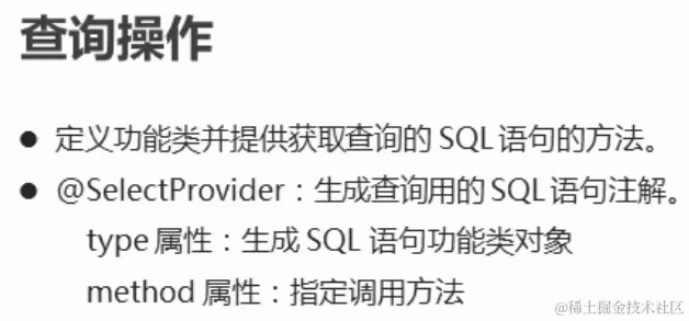 SelectProvider可以生成查询用的SQL语句,其下有两个属性,type和method,前者要传入生成SQL语句的功能类的class文件,后者则要直接写入我们想要调用的方法名,不需要加任何的括号。那么我们可以先构造我们的功能类并写入代码如下