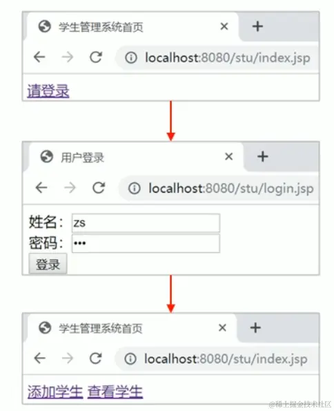 首先我们的浏览器要能够判断是否有用户登录,如果有的话就显示添加或者查看学生的界面,如果没有就显示请登录的界面。