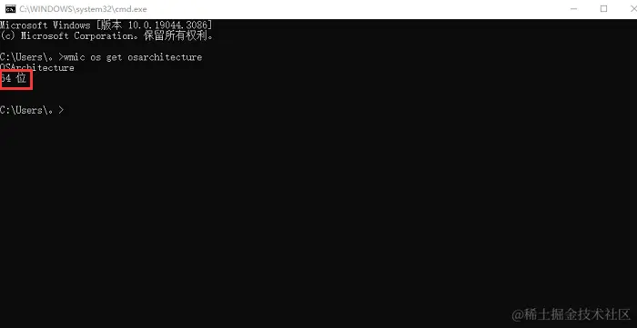 第三步:命令执行后,您会看到 “OSArchitecture” 的结果。如果结果显示为“64位”,则是64位系统;如果结果显示为“32位”,则是32位系统。