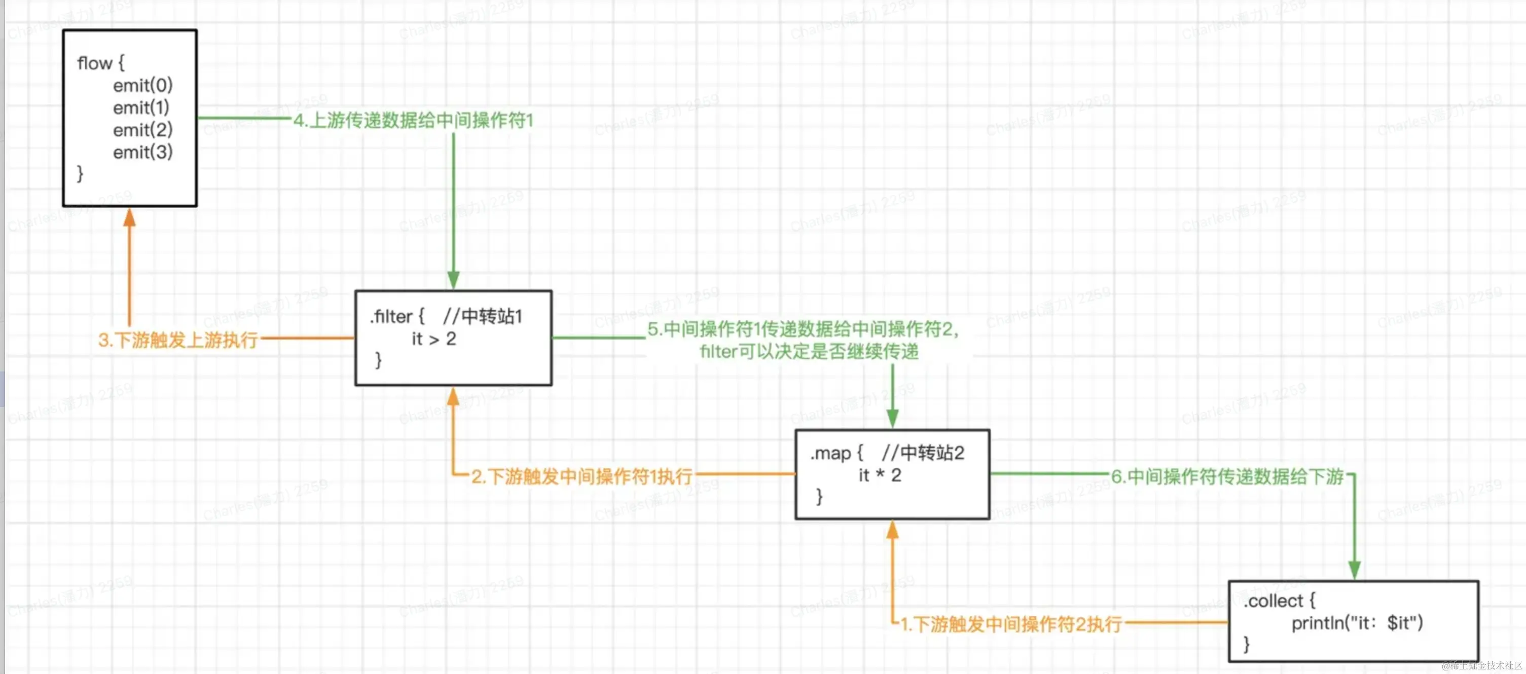 的作用就是创建一个数据流并且将数据发送出去;(2) filter{}、map{}: 这是中间操作符,都是高阶函数,就像中转站一样对数据进行处理后向下传递;