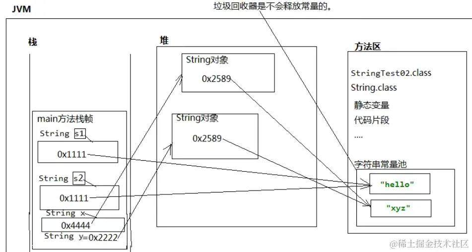 而s2则表示其会在方法区内存中多创建一个储存字符串"xy"的空间,只不过这个空间没有引用去指向它,接着会继续在常量池中创建一个空间用于储存"abcdefxy",然后在栈内存中s2的引用会指向它,这里由于"abcdef"已经有了,所以就不会再次创建了