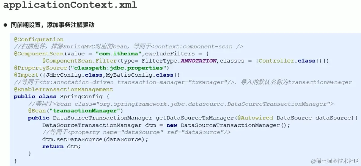 接着我们来做我们的核心配置文件,我们这里很多东西都是一群的老东西了,这些东西就不再赘述了,我们这里重点要讲解的有两个,一个是EnableTransactionManagement注解,另外一个是我们这里事务管理器
