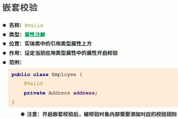 然后我们来讲讲嵌套校验,最简单的例子就是我们在一个对象里引用了另外一个对象,此时我们要进行校验就需要往对应的属性上加入Valid注解,然后在对应的实现类里添加对应的校验规则