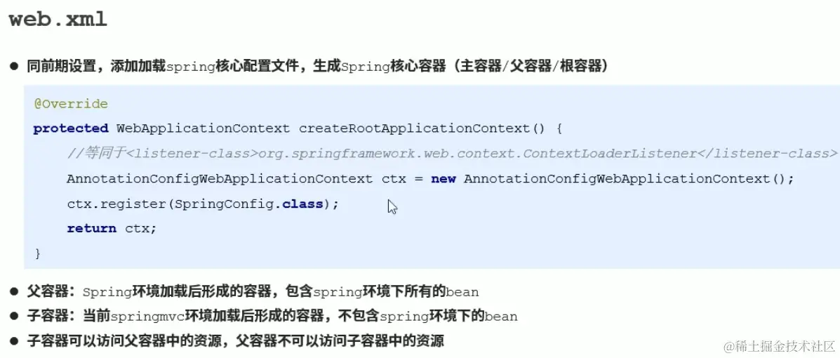 但是在上面的类中,存在两个方法,分别是createRootApplicationContext和createServletApplicationContext,前者是用于加载Spring的,而后者是用于加载SpringMVC的,因此如果我们希望加载Spring的核心配置文件,我们只要使用和前者一样的写法就可以了,我们之前加载spring核心配置文件的方法是令其返回null的,因为那时我们还不需要在这里加载Spring的核心配置文件