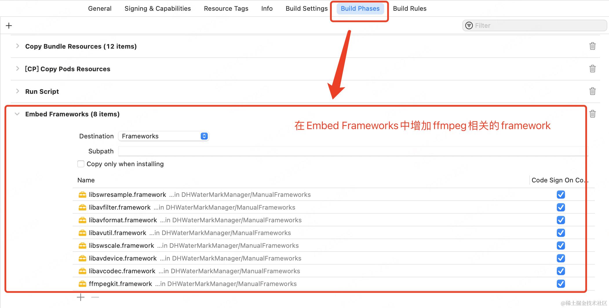 请注意让"Build Phases"中的"Run Script"在"Embed Frameworks"之后,才能在app中已嵌入Framewoks后执行"Run Script"。