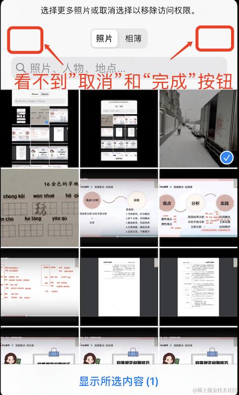 (4)在iOS14系统中使用 TZImagePickerController 弹出图片选择器,但是不显示"取消"和"完成"按钮: