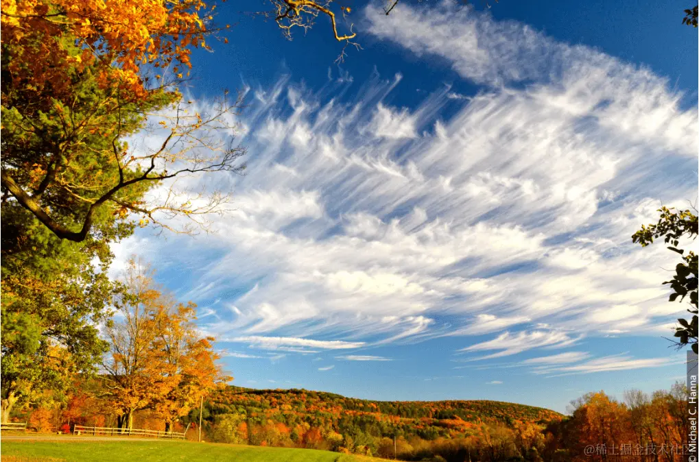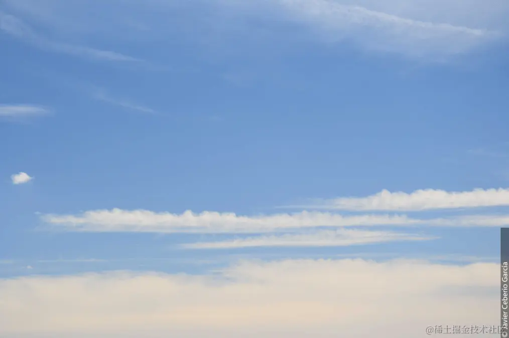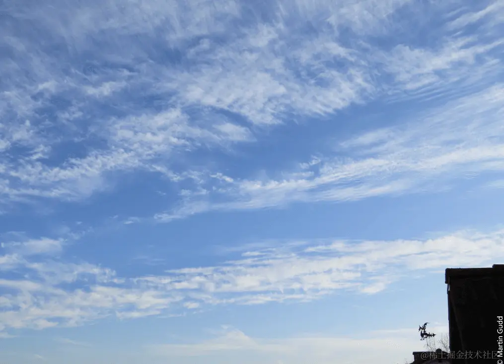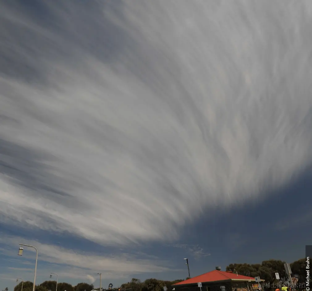 卷云有非常明显的结构特征——白色细腻的弯曲丝线状并排在一起形成窄带,厚度上非常的轻薄。