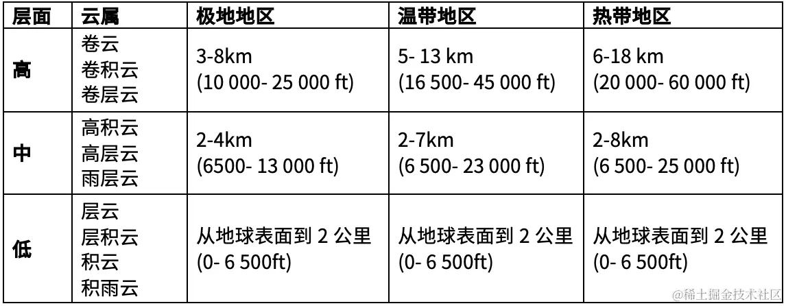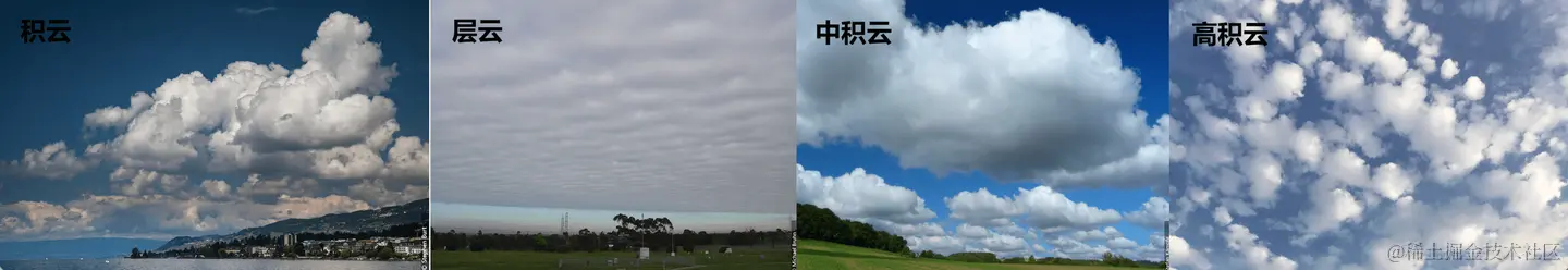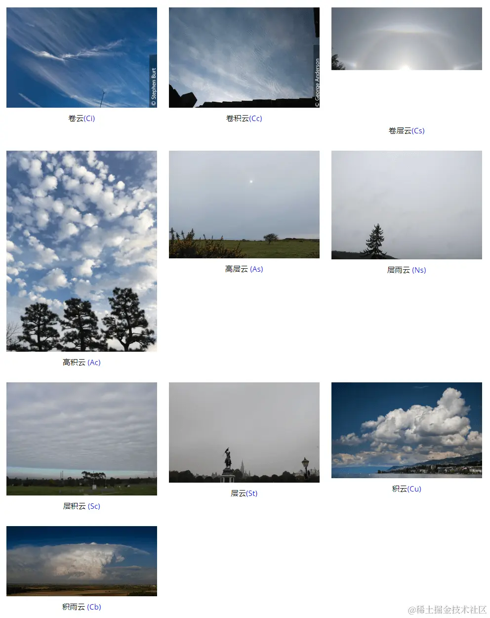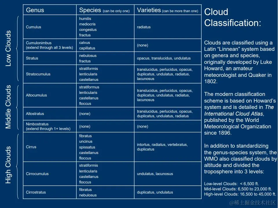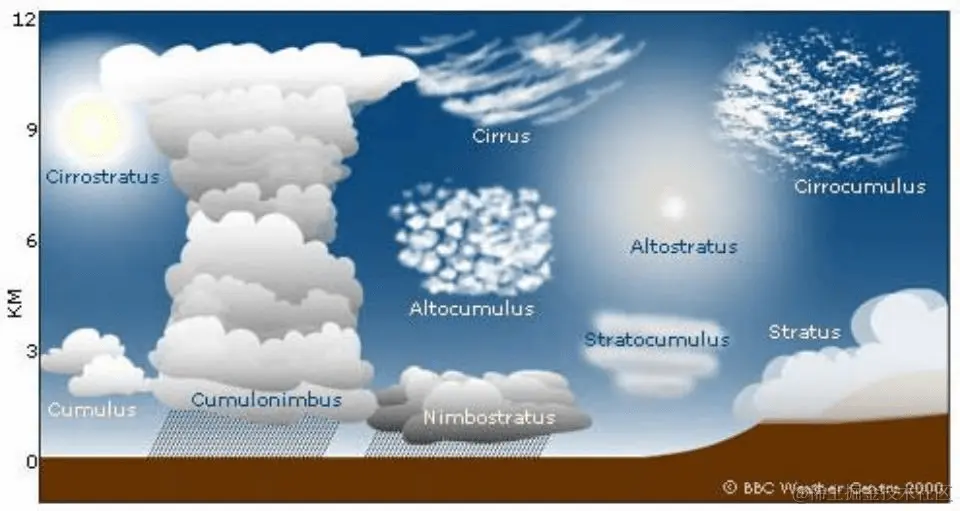 上图内容大致是云的种类由低到高分别为【低云族】“积云(Cumulus),积雨云(Cumulonimbus),层云(Stratus), 层积云(Stratocumulus)”;【中云族】“高积云(Altocumulus),高层云(Altostratus),雨层云(Nimostrartus)”;【高云族】“卷云(Cirrus),卷积云(Cirrocumulus),卷层云(Cirrostratus)”。