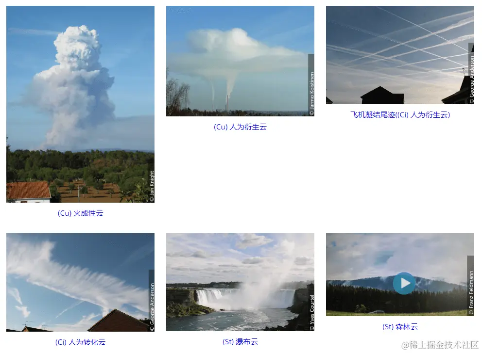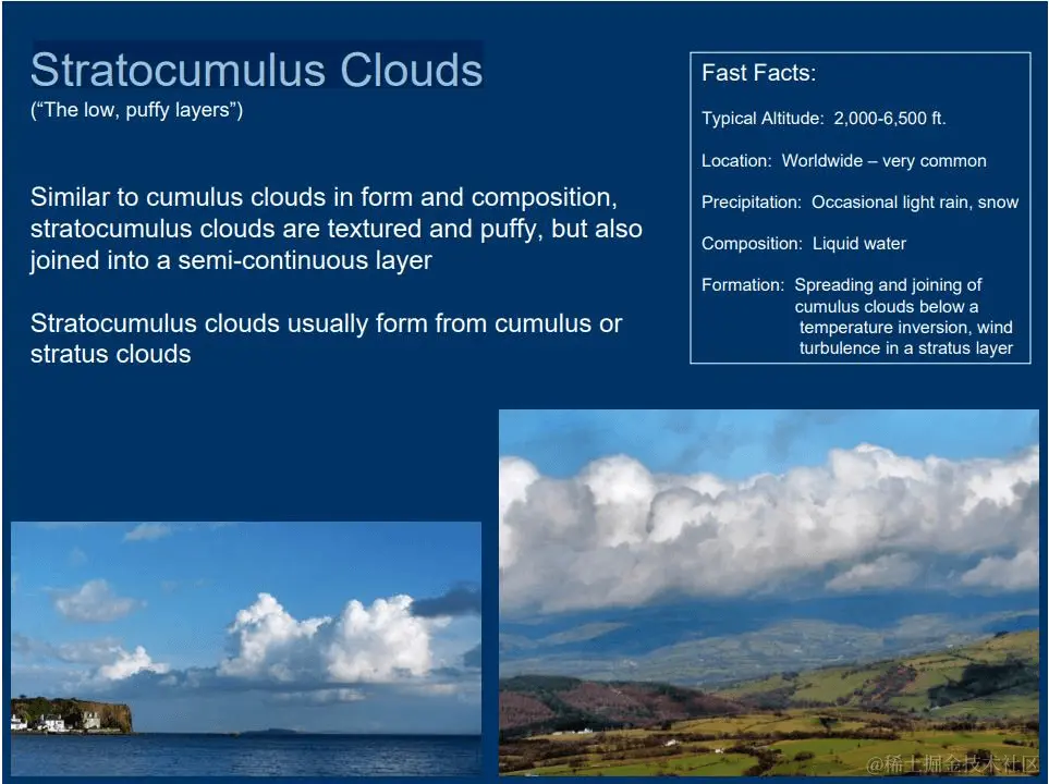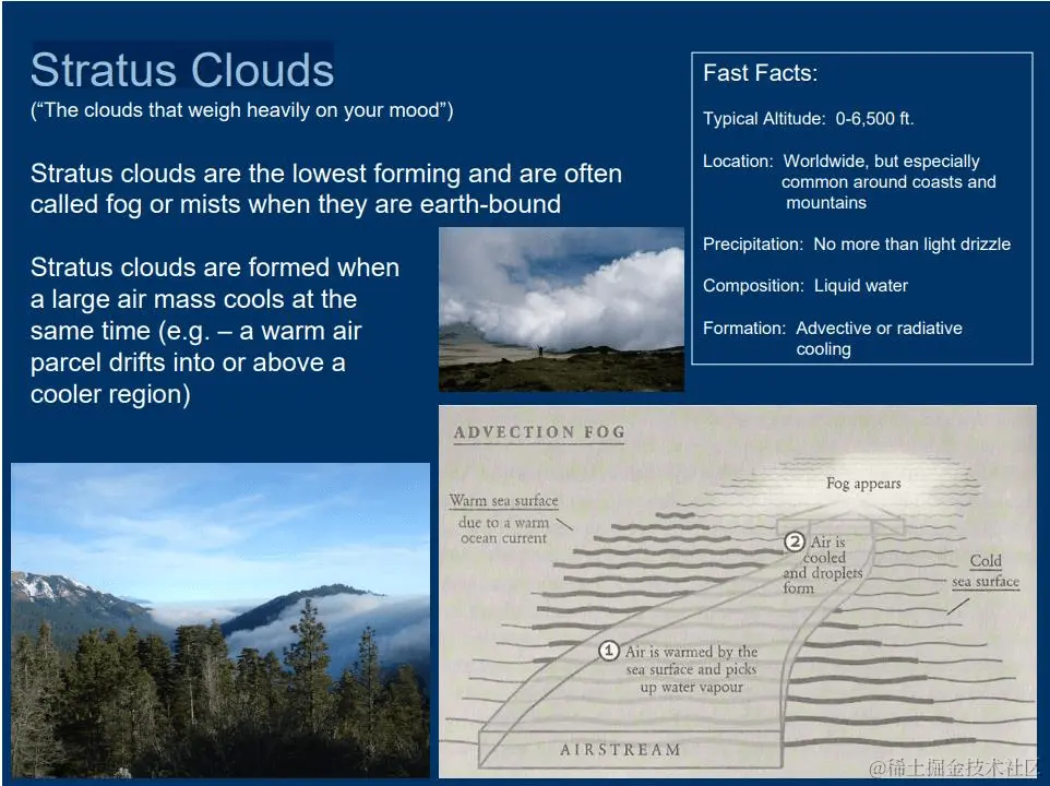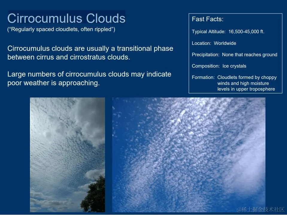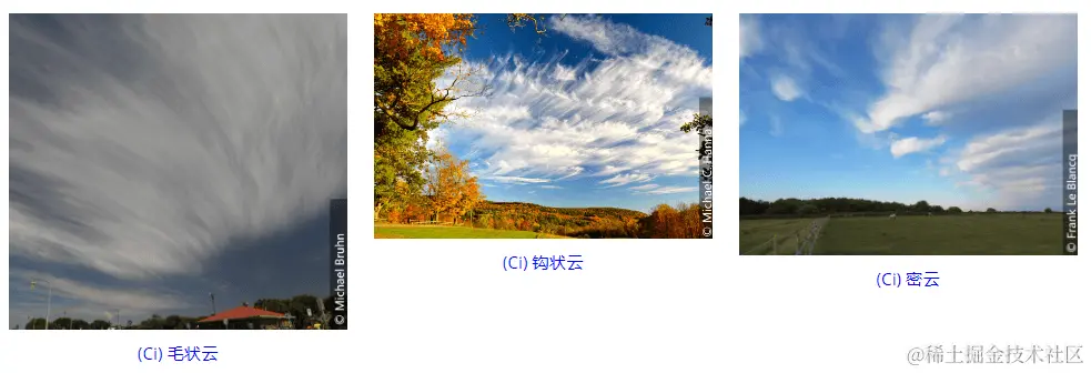 上图内容大致是云的种类由低到高分别为【低云族】“积云(Cumulus),积雨云(Cumulonimbus),层云(Stratus), 层积云(Stratocumulus)”;【中云族】“高积云(Altocumulus),高层云(Altostratus),雨层云(Nimostrartus)”;【高云族】“卷云(Cirrus),卷积云(Cirrocumulus),卷层云(Cirrostratus)”。