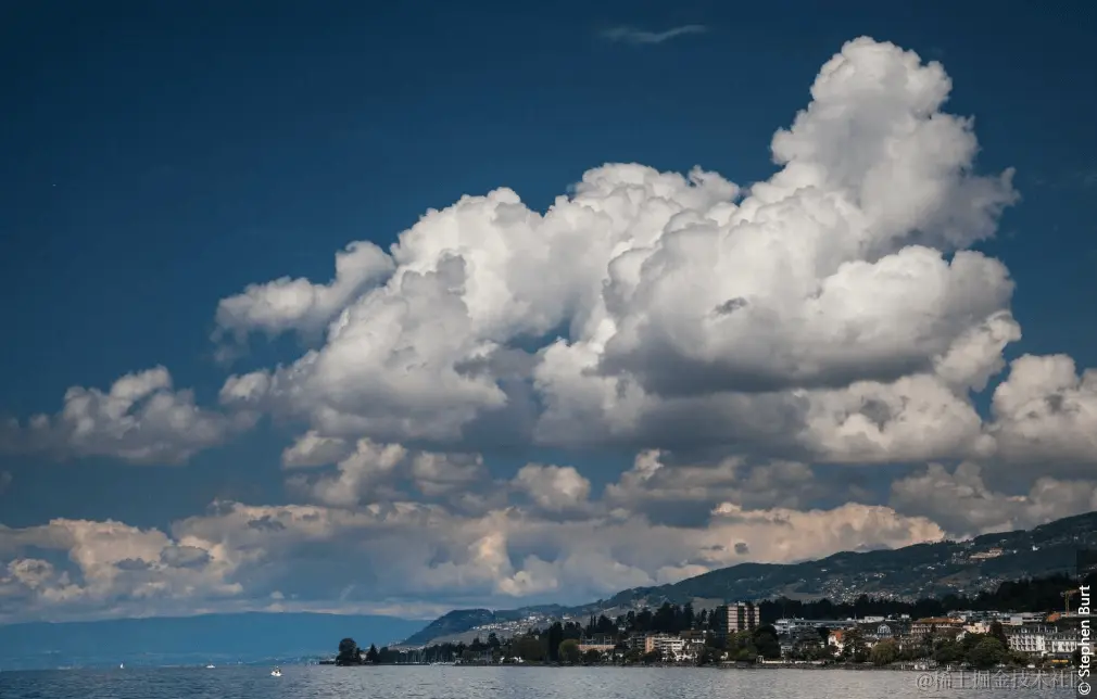 图为:浓积云正在蒙特勒后面的瑞士阿尔卑斯山脉和瑞士日内瓦湖沿岸发展