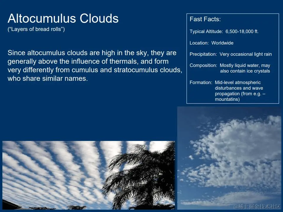 高积云一般成絮状,有时呈纤维状,通常带有阴影。上图与下图分别展示了层状,絮状高积云两个云种。