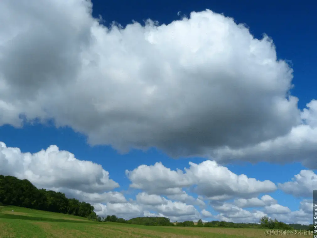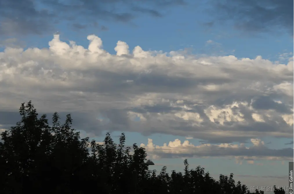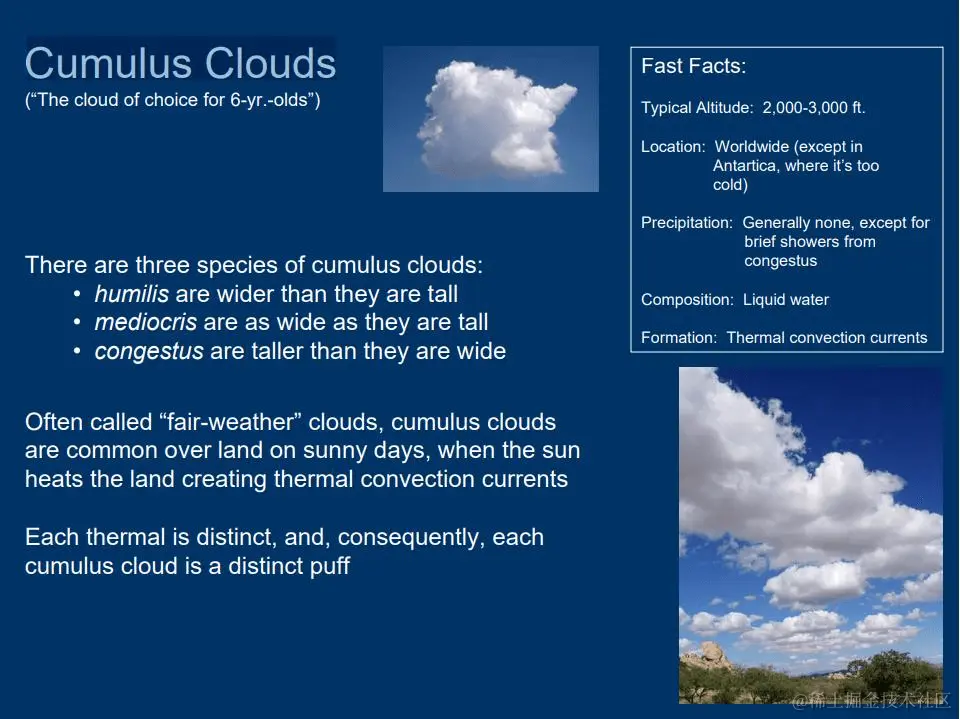 积云是距离地表最近的,因此也是密度最大的,按照第一部分云的四个主要特性的维度去分析:积云具有最清晰的轮廓,上部分类似花椰菜或山丘,底部则相对较平,这些云被阳光照射部分多为白色,底部相对较暗,这可以用Beer-Lambert定律解释。典型的形态如下:
