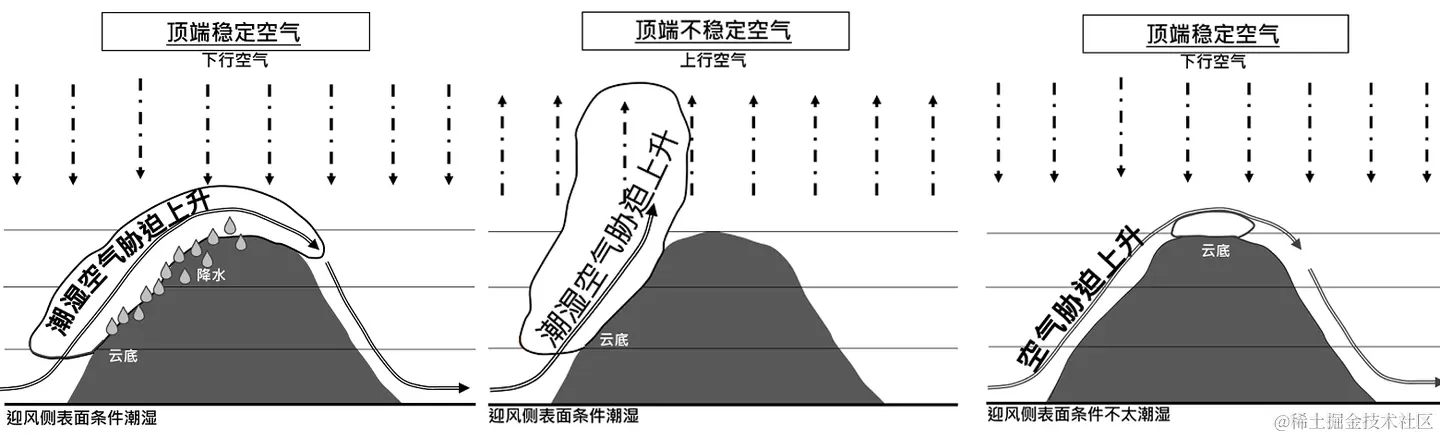 总结性的规律是,当气流穿过山谷,丘陵或山脊时会受到障碍影响而被迫抬升——“地形抬升”,至于抬升的气流是否能形成云还与空气稳定性,水汽含量与温度分布有关,白天温度较高空气也会升腾,如果含水量较高且空气相对稳定,则升腾的水汽会在高空冷凝形成云。因此云的形成受地形抬升与热抬升的共同影响。