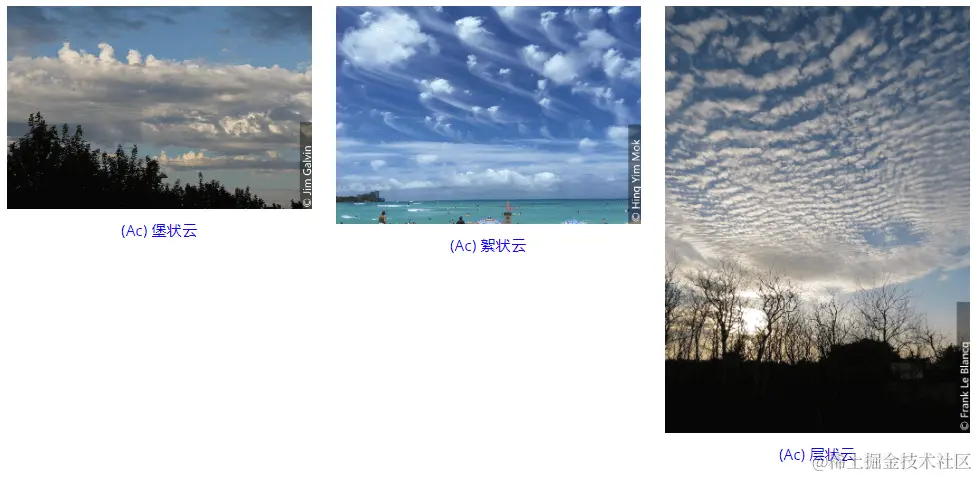 又如堡状云(Ac),絮状云(Ac),层状云(Ac)都属于高积云: