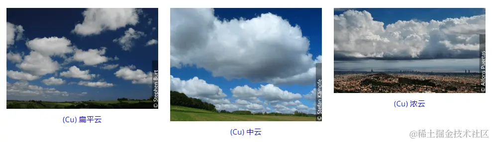 再如扁平云(Cu),中云(Cu),浓云(Cu)都属于积云: