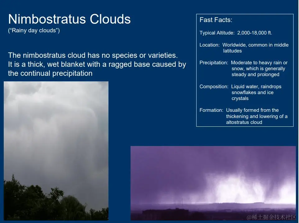 颜色上雨层云一般为黑色,偶尔为灰色,云层始终非常厚。