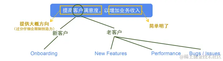 大目标通常由 CEO 或 C-Level 等高层管理者设定。它们可能是增加营业额、提升客户满意度、提高客户留存率等;要达到这些目标通常需要多个部门共同努力。