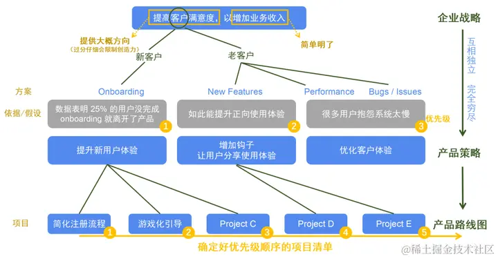制定产品策略的第一步就是找出企业战略中与「产品」最相关的 3~5 项,比如「提高客户满意度,以增加业务收入」。