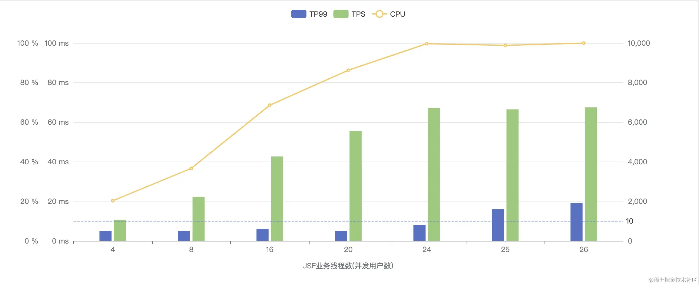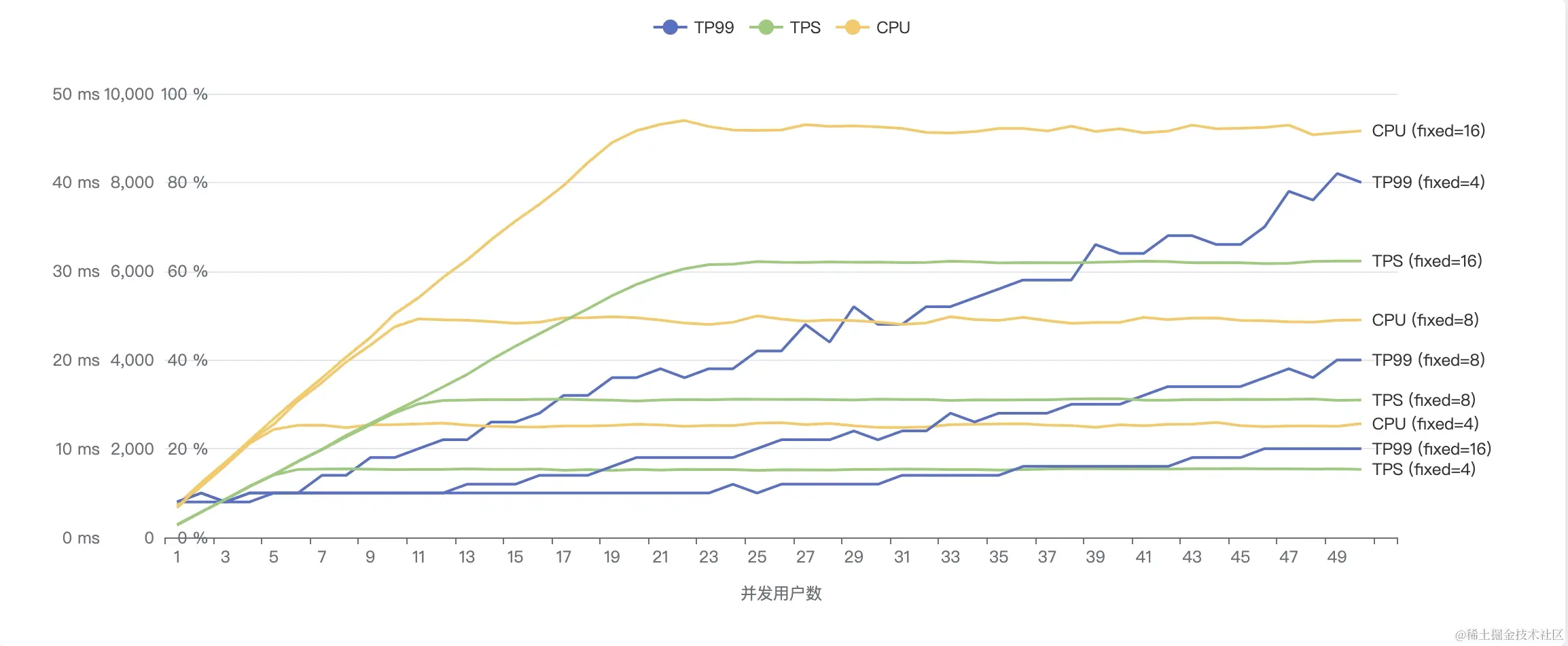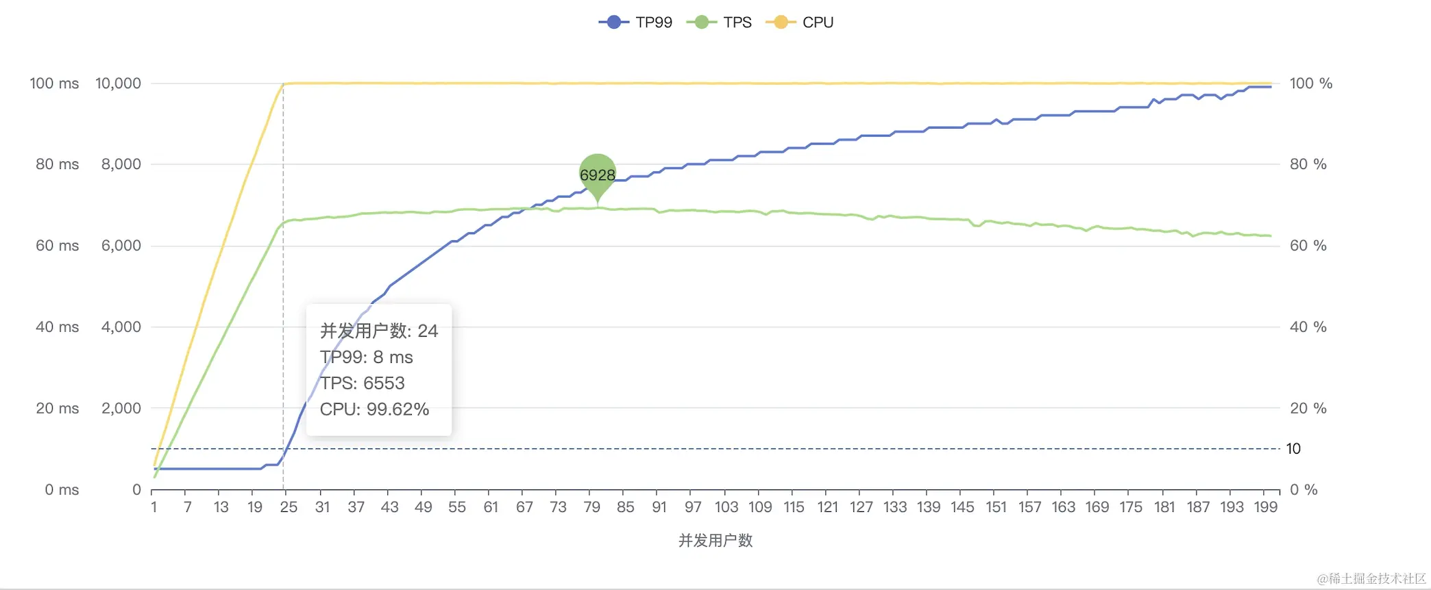 | 并发用户数 | TP99 | 吞吐量TPS | CPU利用率(%) |