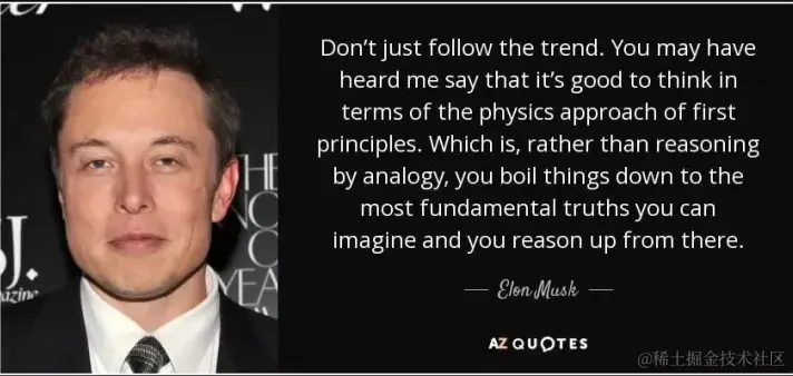 反之,如果我们加入自己经验或类比,则违背了第一性原理的出发点,使得后面所有建立起来的推导或是结论都是站不住脚的,也许某些情况下,猜测和粗暴的重启活动能够暂时性地解决问题,但长期来看,类似问题还是会存在。就比如我们去网吧上网发现机器坏了,网管一般会让你重启一下机器一样,因为网管这个时候加入了自己的经验判断,那就是重启就能解决问题,虽然大多数时候也很管用,但这很多时候其实并不是一种从根本上解决问题的办法,我想我们作为研发人员,应当具备一种刨根问底,切入本质的思维模式,这种思维模式就是利用好第一性原理。