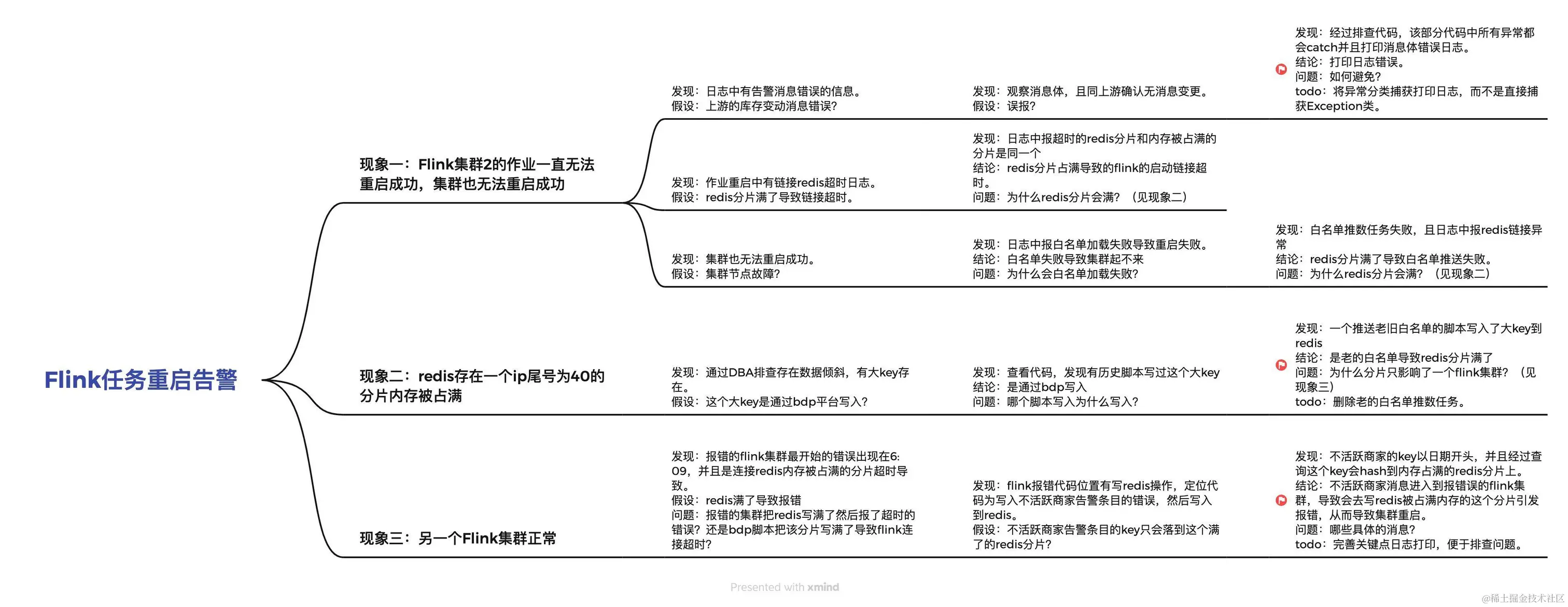 上图可以看到,从收到Flink重启的告警出发,发现三个现象(或者说三个为什么),一直沿着这三个现象往下分析,逐步剥开问题表象,推导出导致问题的根本原因,最后收敛成了三个结论(标记位置),并进一步针对收敛出来的结论深入挖掘本质,从而导出我们下一步的todo项。
