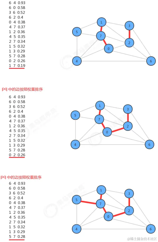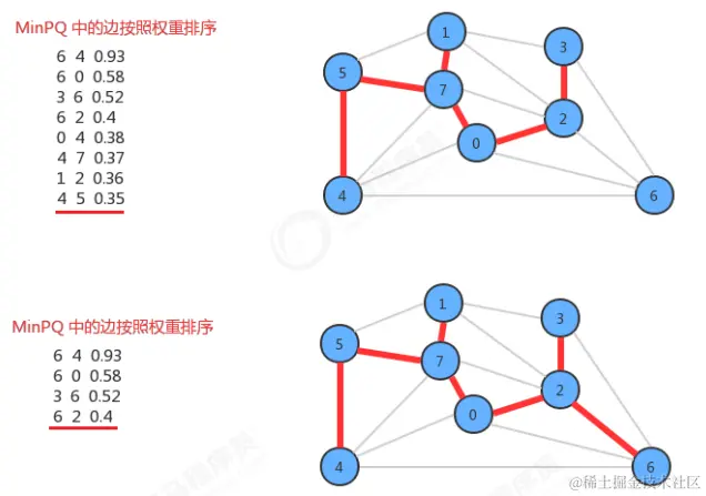最后我们添加玩0.4加权边以及62两个结点之后,剩下的三个加权边都会因为在并查集判断里无法通过而不加入