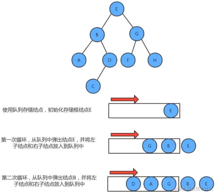 * 结点,因此visit();方法这样构造代码可以理解为队列里执行了出队列的动作,并