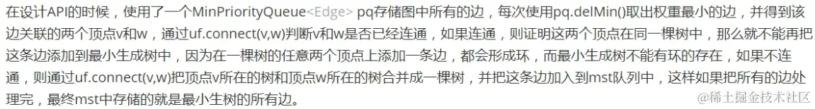 //pq不为空时继续循环很好理解,但是为什么这里要求mst存放的最小生成树的边不大于其结点数