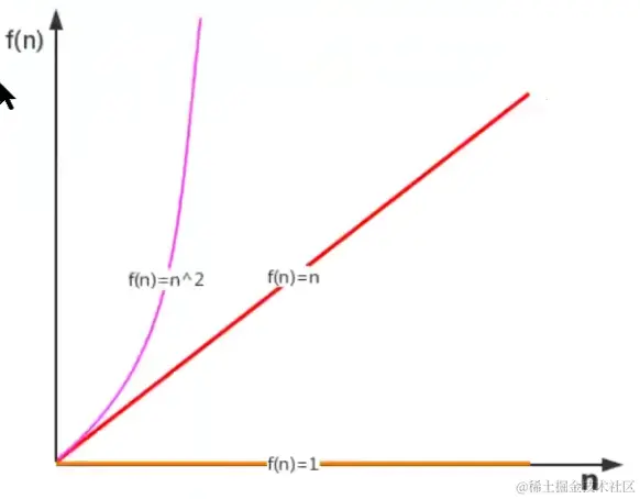 在本图里,n是我们的输入规模,f(n)是我们的运行时间,而f则是我们的代码核心运行次数