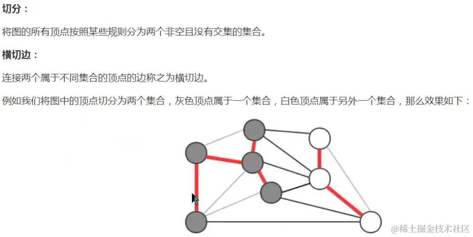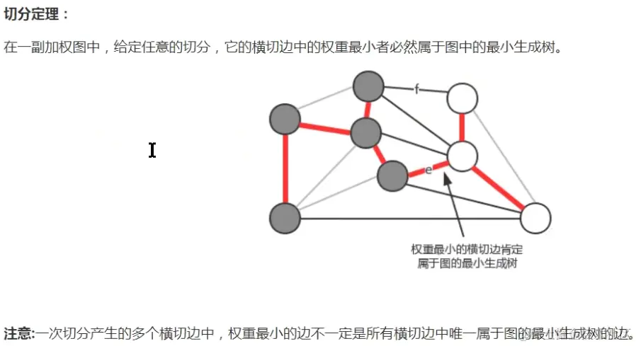 简而言之,prim算法时将一个无向加权图的一个结点默认为最小生成树,然后利用该结点遍历完整个树,每次切分添加一条边最终构造出整个最小生成树。而kruskal算法则是会将整个无向加权图视作一个森林,无向图中有几个结点,里面就有几棵树,而kruskal算法每一次处理都会将两棵树连接成一棵树,这个过程是通过将两棵树看做两个集合,然后运用切分定理每次找出最小横切边,然后将两个树利用这条边结合成一棵树,这样不断周而复始最终构造出一个最小生成树