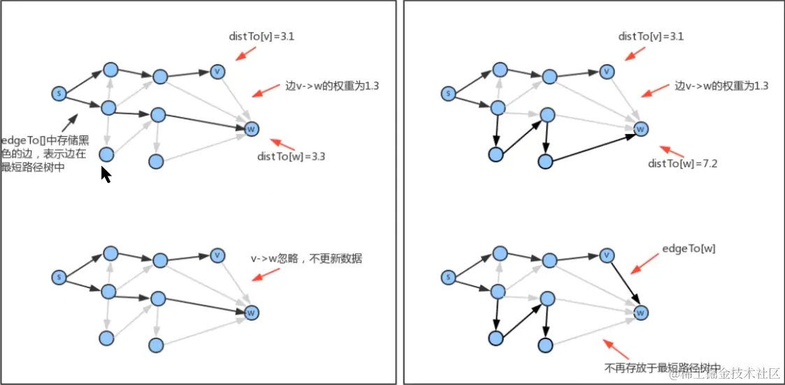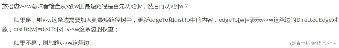 //就可能存在distTo[w]比起更大或更小的情况,这里你如果更小,那么就说明有必要更新最小权值
