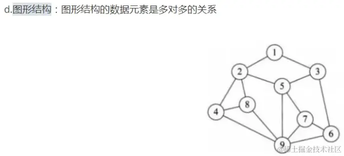 图形结构的数据元素存在着多对多的关系,具体到下图的例子是5对应7,9,3,2