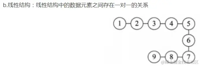 线性结构中的数据元素存在一对一的关系,具体到下图的例子里是一对应着二,二对应着三,三对应着四