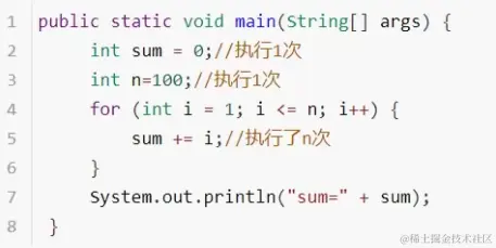 我们不难发现,这个代码真正执行的次数的总和为2n+3次,而用于计算结果的代码执行的次数则为n次