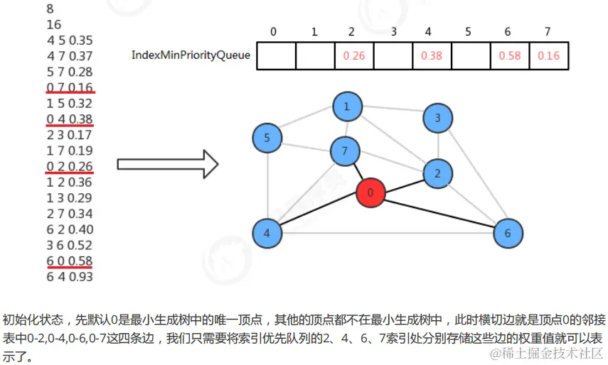 * 遍历索引最小优先队列,拿到最小横切边对应的顶点并将该顶点加入到最小生成树中