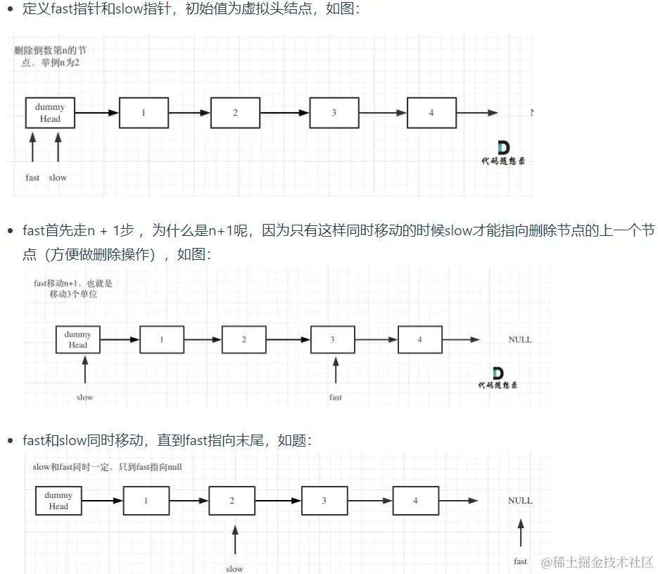 这里我们的思路是先定义出两个指针,第一个指针指向前置结点,另一个指针指向第n的结点,n为其要删除的倒数结点,然后我们将这个指针一起前进,这样当第二个指针到末位的时候,第一个指针就正好指向要删除的结点的前一位,此时进行链表结点的删除就可以了