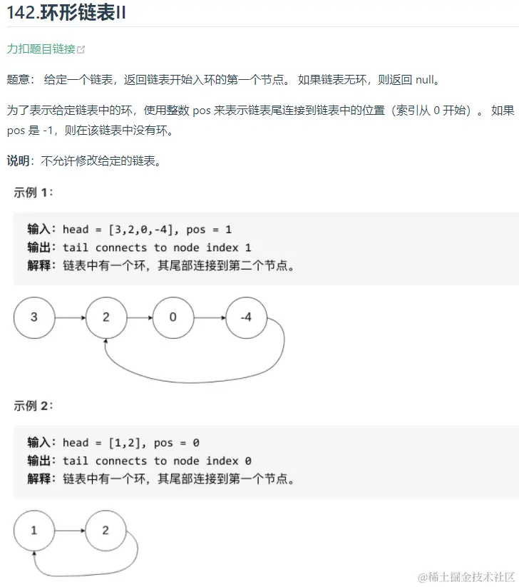我们这里判断其是否有环的方式是定义两个指针,一个指针每次循环前进一位,另一个指针每次循环前进两位,如果该链表有环,则最终其一定会相遇。接下来的问题在于如果判断环的入口,一个简单的想法是通过Set集合从头遍历链表,当加入的链表内存地址相同时就返回那个链表,这个方法很容易想到,但是其效率较低,因为只要用了哈希表效率一般都不咋地。我们有一个方法就是当我们的快慢指针相遇时,我们立刻在链表头部定义一个新指针,然后新指针和相遇的指针每次循环都前进一步,最终他们相遇的第一个结点就是链表的环入口。这里面的证明涉及到数学过程,这里就不给了