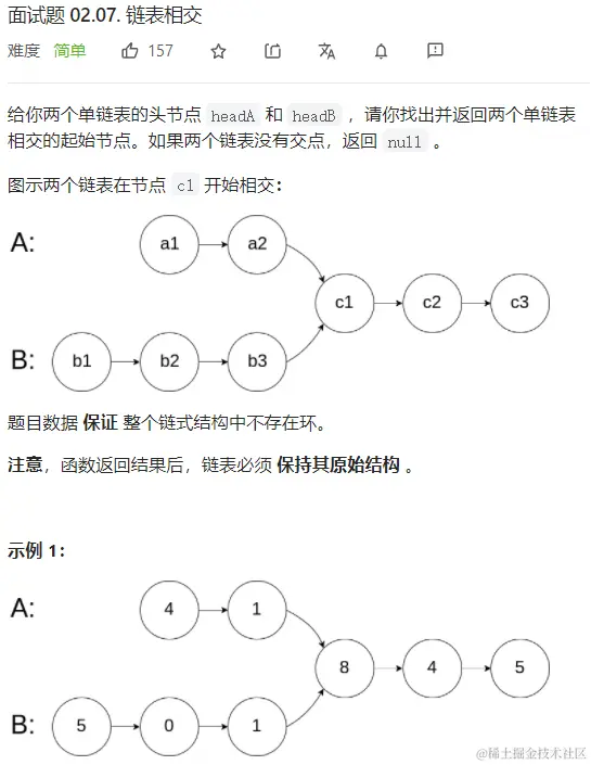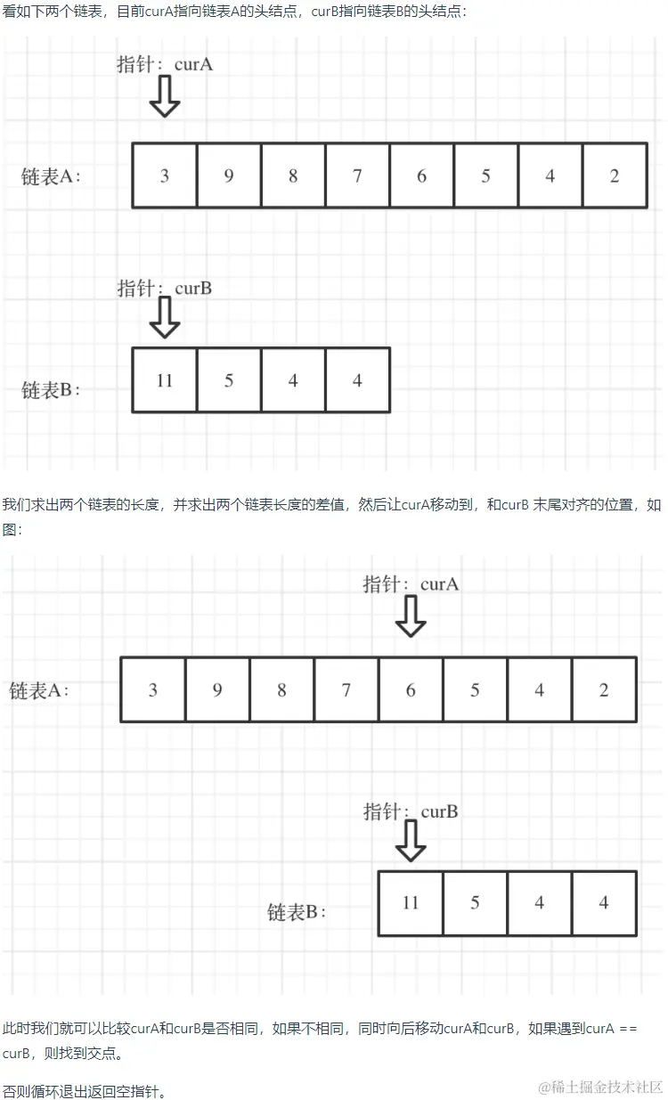 注意我们这里并没有使用前置结点,这是因为这里前置的结点根本就不需要,因此不需要用,当然,我们嗯加上去也是可以的,不过完全是多此一举。其次是这里我们对长度进行了一个修正,总是让headA代表的链表为最长链表,这样就只需要处理一种情况就可以了