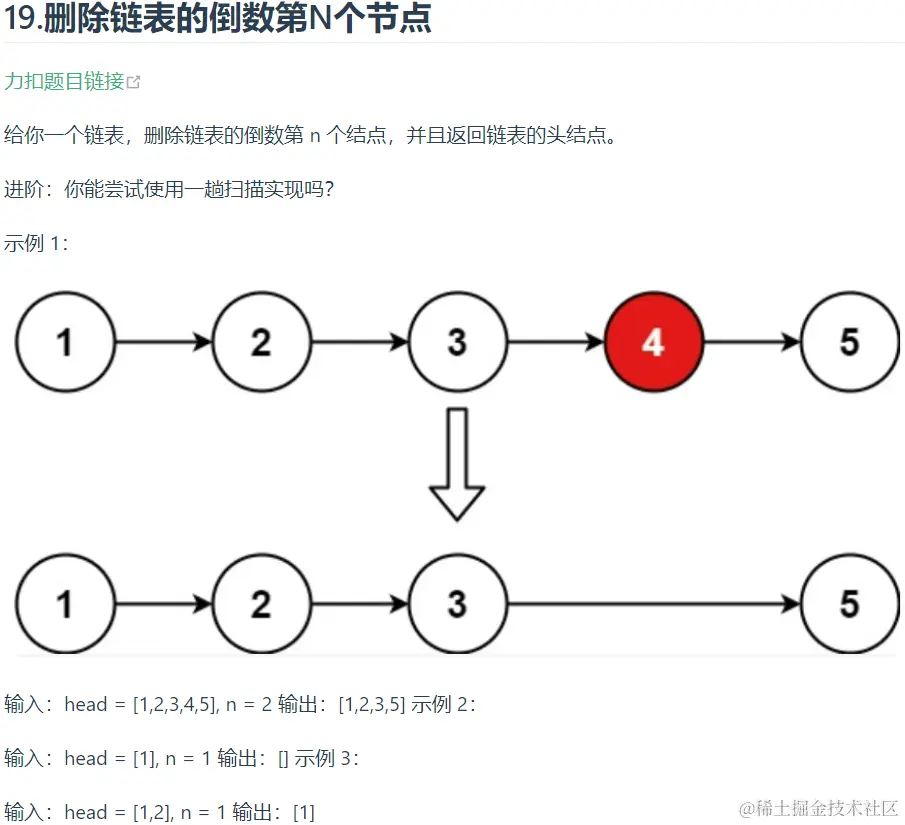 进一步加深理解双指针法,我们继续做下面这一题。我们对下一题要用上双指针法,前置节点法