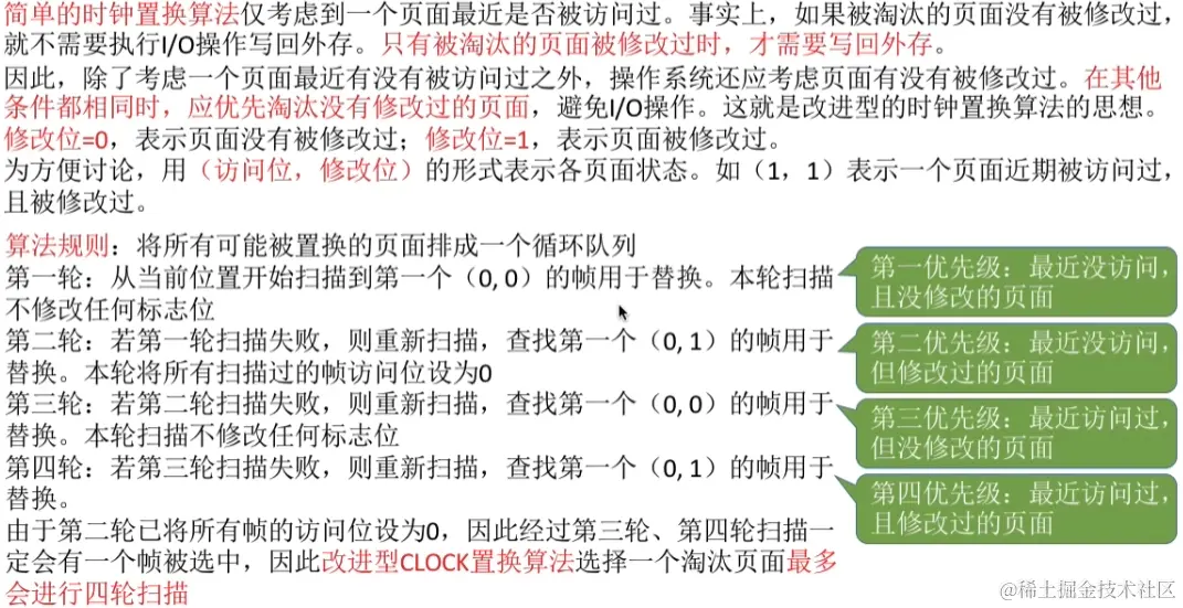 要实现该算法需要往页表项中添加一个修改位,当其值为1表示被修改过,反之则是没修改过,同样也是将所有可能被置换的页面排成一个循环队列,第一轮淘汰最近没被访问且没修改的页面,也就是访问位为0,修改位为0的页面,后面用(0,0)表示,第二轮淘汰最近没访问过,但修改过的页面(0,1)同时会将所有扫描过的页面的访问位设置为0,第三轮淘汰最近访问过但是没修改的(0,0)页面,第四轮淘汰最近访问过且修改过的(0,1)页面