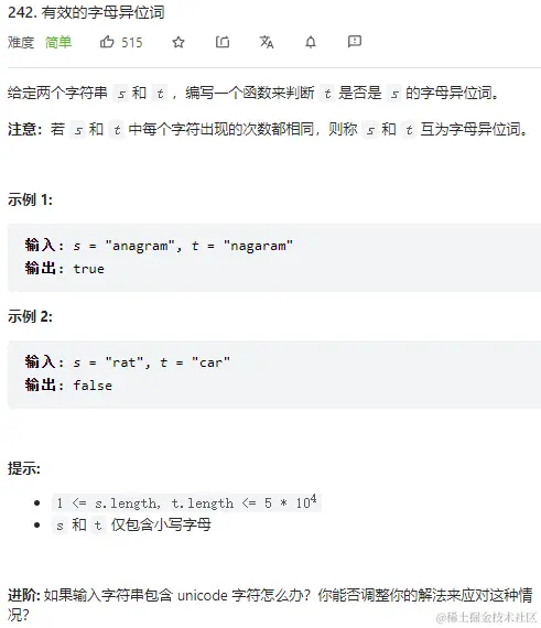 接着我们再来讲一种比较取巧的方式,就是其实我们也可以利用排序方法的来解决这个问题,因为本题的要求里只要两个字符串的数量一样就可以了,而不论其是什么排序,因此我们可以使用排序来解决这个问题。请看代码