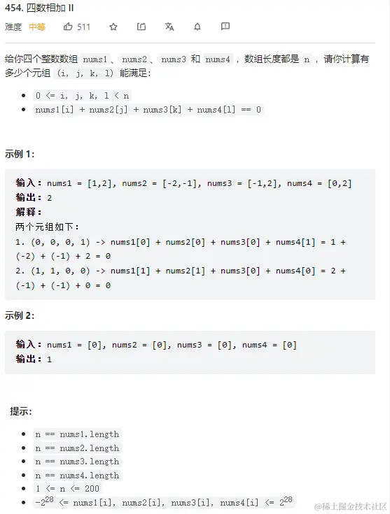 观察这道题可以发现其需要统计四数相加为0的数组的个数,我们需要统计总数,而本题目虽然不要求返回下标,但是对于顺序不同的重复元素其也是计算在内的,因此我们可以利用Map集合进行统计,最后遍历Map集合来获得我们所符合条件的答案个数