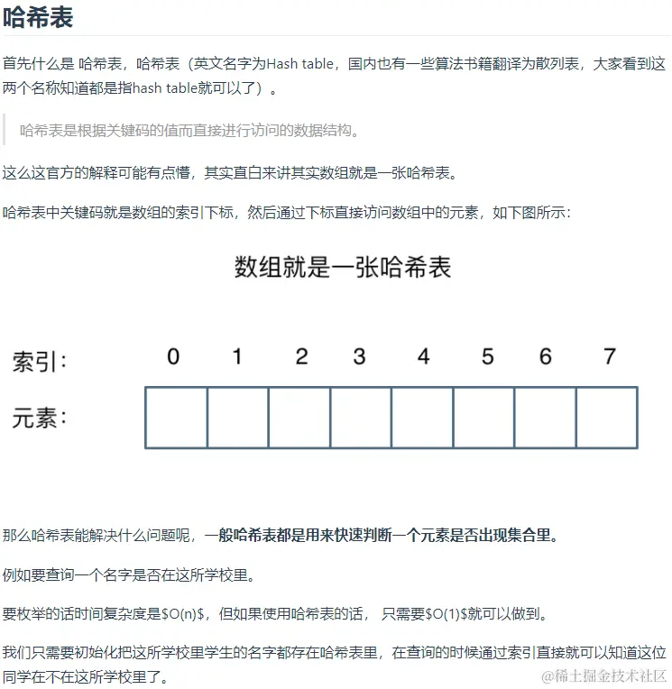 不过有同学似乎有个疑问,就是我们这里似乎也没有使用哈希表啊,为什么又将其归置为哈希表的一种呢?我会说,可别忘了数组也是一种哈希表的结构