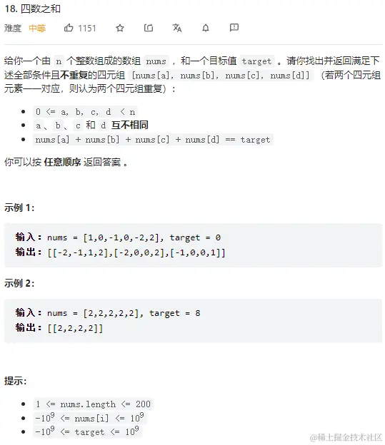 按照这种思路我们也可以解决五数,六数之和,我们也可以依葫芦画瓢,当然如果推广到n数之和的话,我们就应该想些其他更好的方法了,因为我们不能每多一个层级我们就手动多构建一层for循环。当然了,那不是我们现在所能够解决的题目