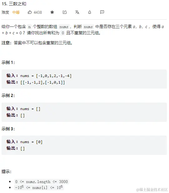 本题统计三元组,我们按照上面讲过的思路,我们必然要往哈希表的Map结构上去思考,同时我们要想办法将for循环与值的和结合起来。我们注意到本题不要求返回数组下标,那么我们就可以先对数组进行排序,这不用耗费多少时间,因为java内置的排序方法总是非常快的。然后我们去一次遍历整个数组,再用双指针确定左右边界进行解题,由于本体不允许包含重复的三元组,因此我们在循环时还要跳过重复的元素的统计。根据上面的思路,我们可以构造代码如下