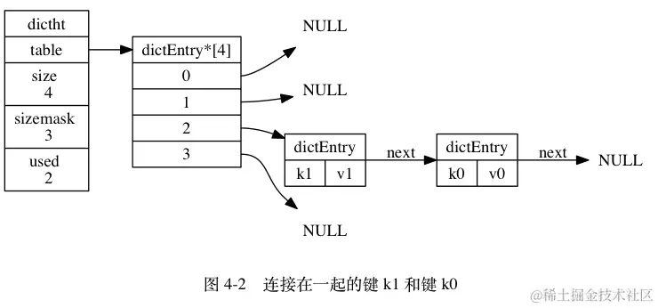 table是一个数组,每个元素都是一个数值存放节点。 每个节点都是一个dictEntry结构体,其中key和value都是一个指针,指向实际存储的数据。 源代码如下所示: